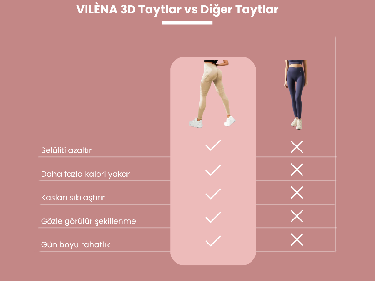 VILÈNA 3D tayt, gün boyu yoğunlaştırıcı desteğiyle dolaşımı artırarak o hissi azalttı.